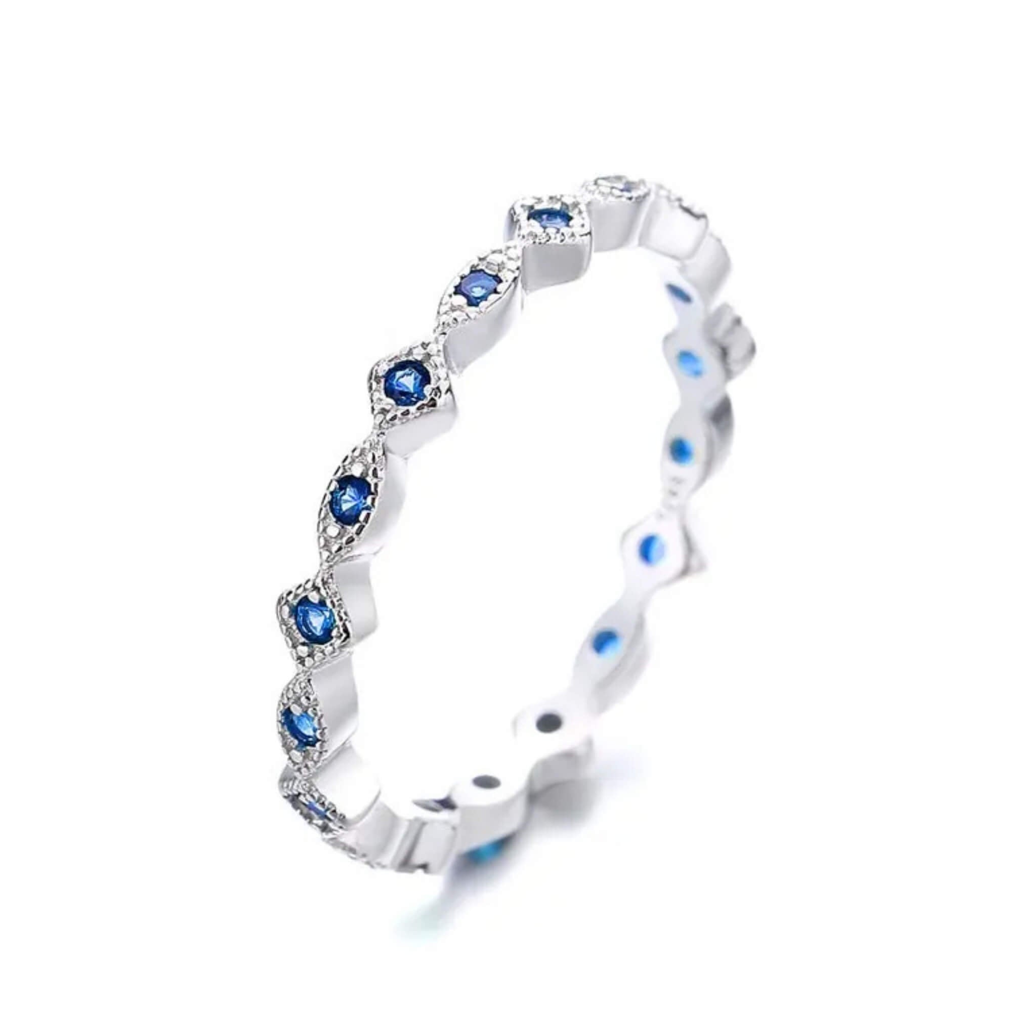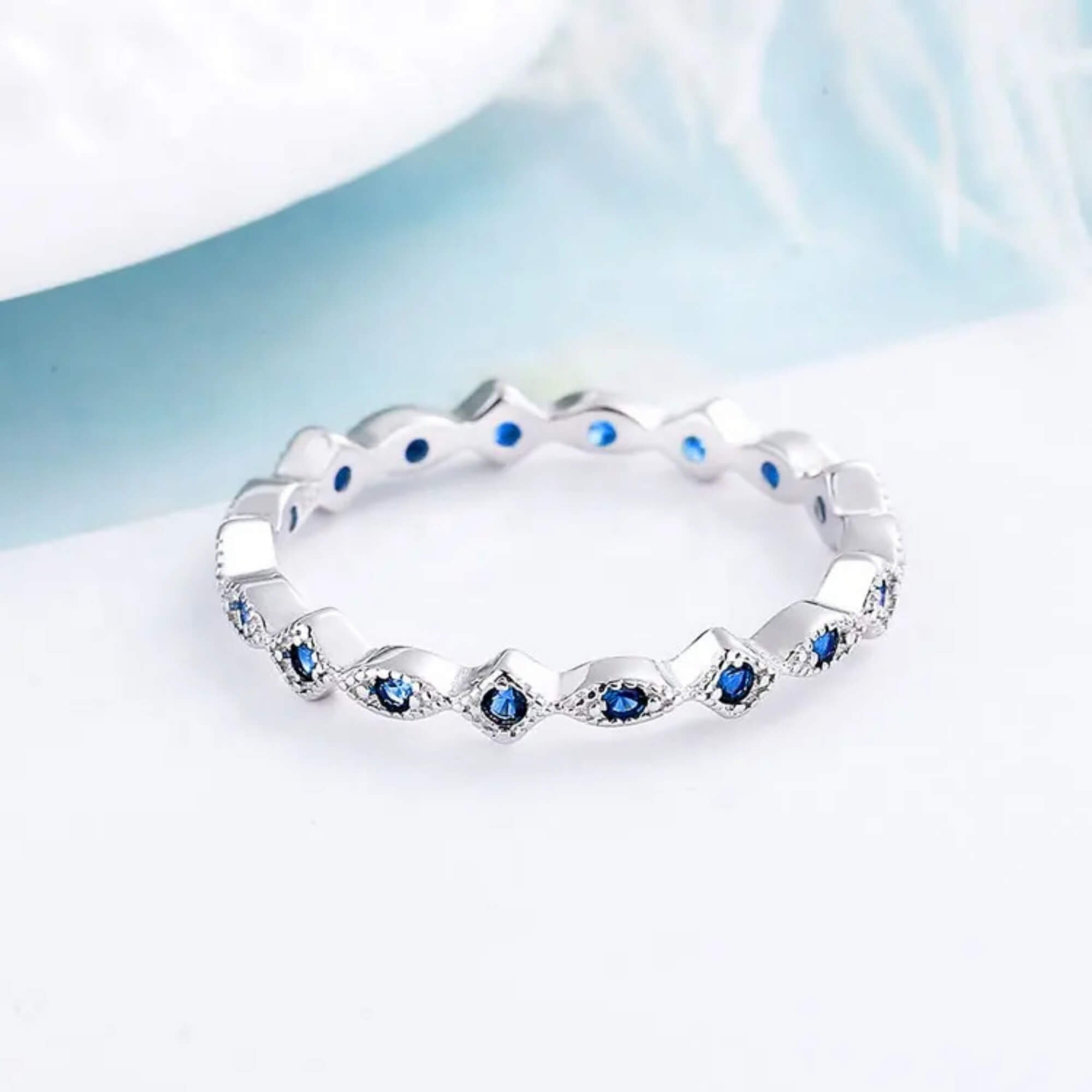 Sterling silver ring with a repeating pattern of marquise-shaped elements, each holding a deep blue cubic zirconia. The design draws from the traditional blue eye, often linked to protection, reimagined in a clean, modern form.