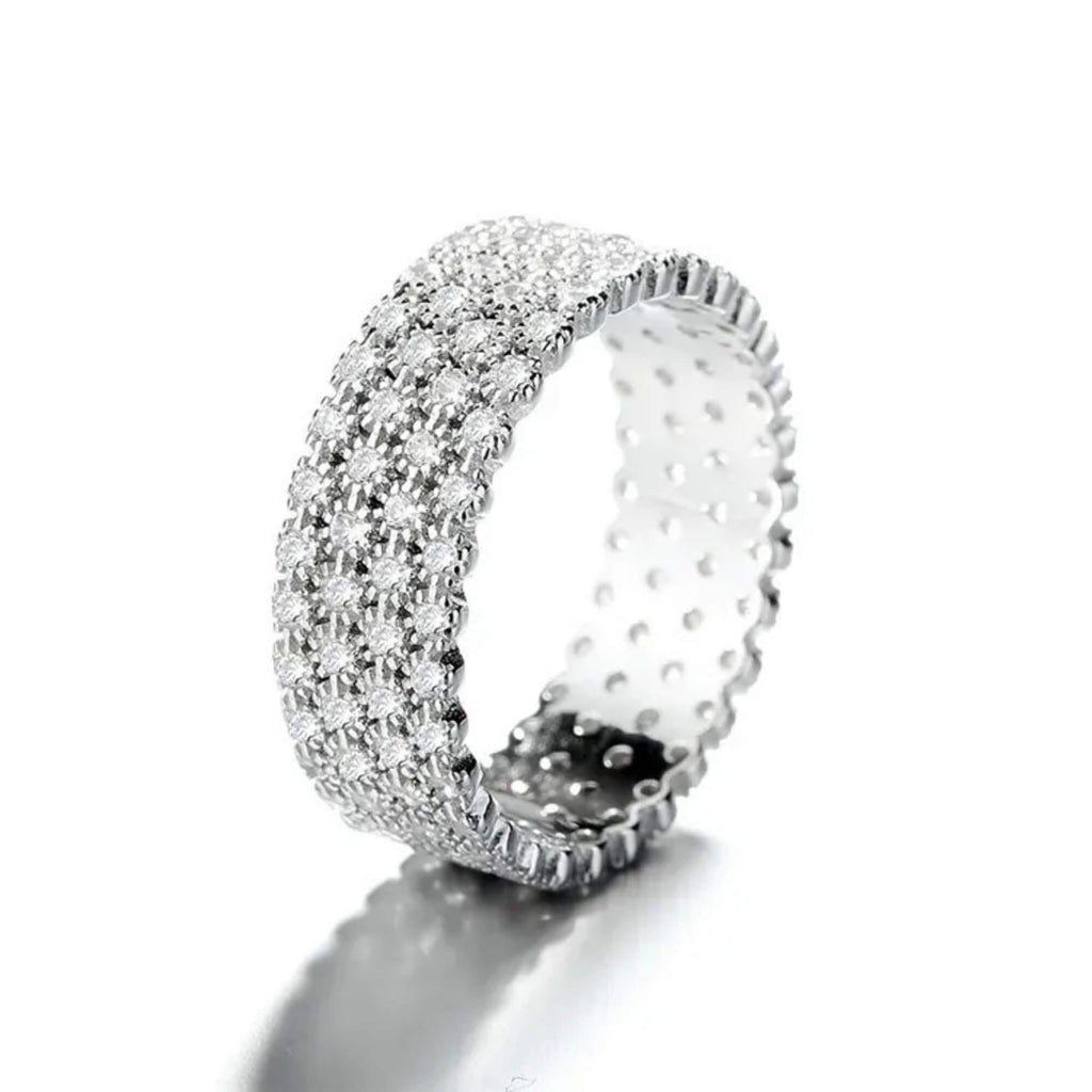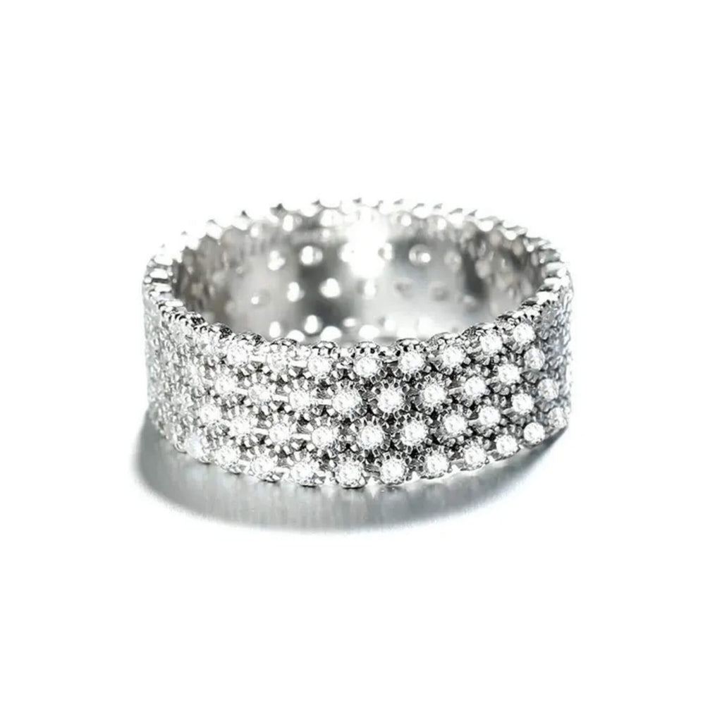 Sterling silver ring featuring four dense rows of cubic zirconia stones arranged in a tight, even pattern. The full-band setting gives it a bold presence and eye-catching shine, making it a strong standalone piece or a bright addition to a stacked look.