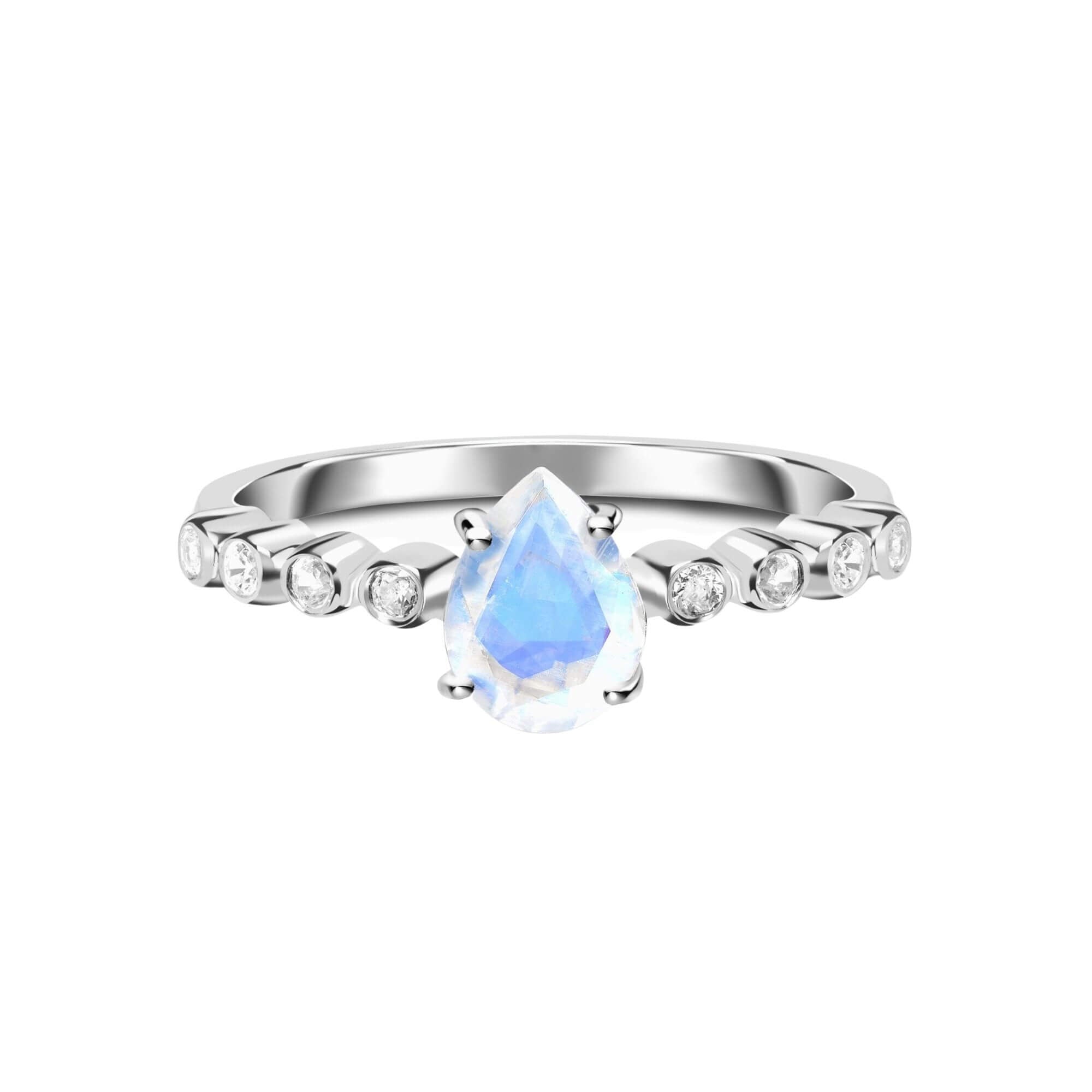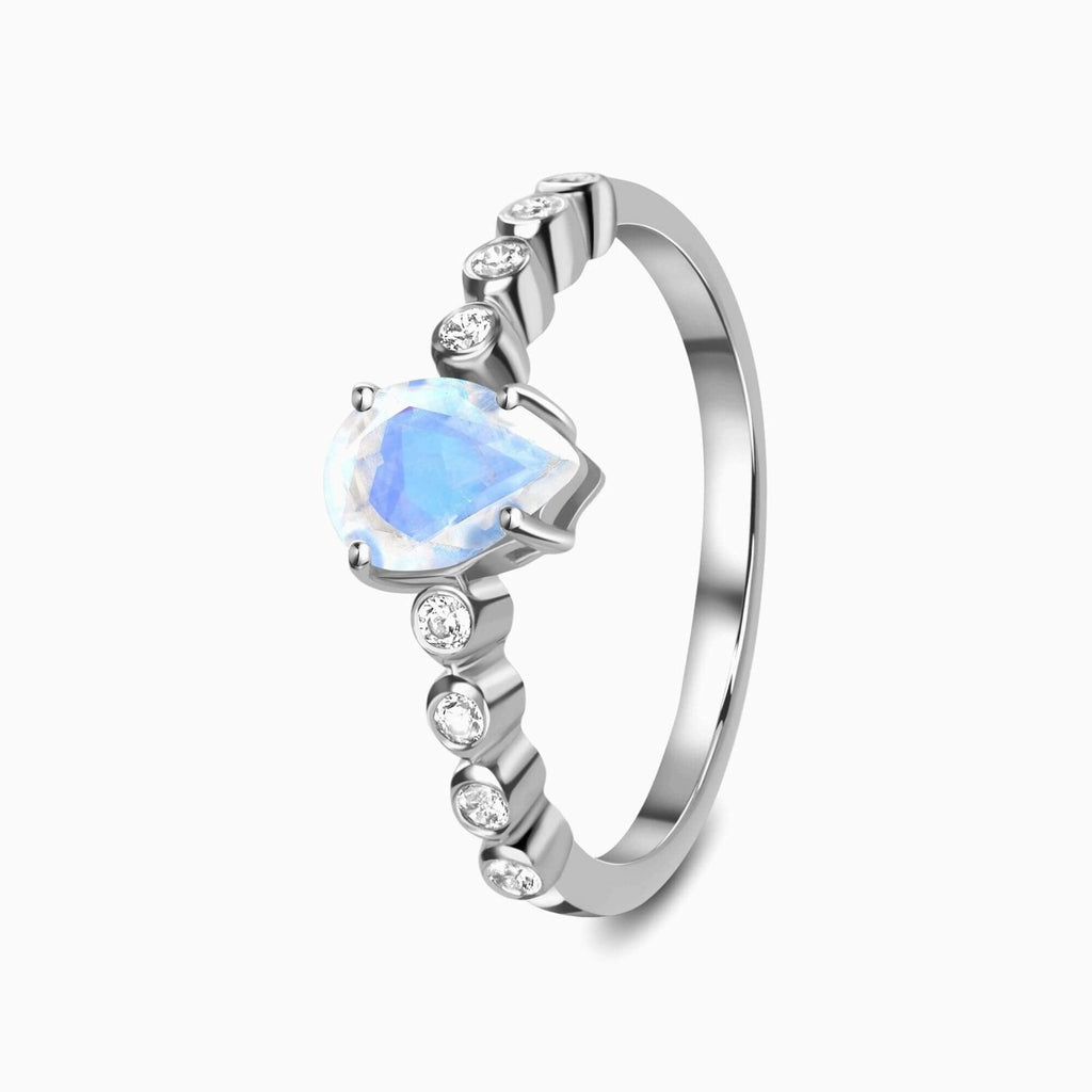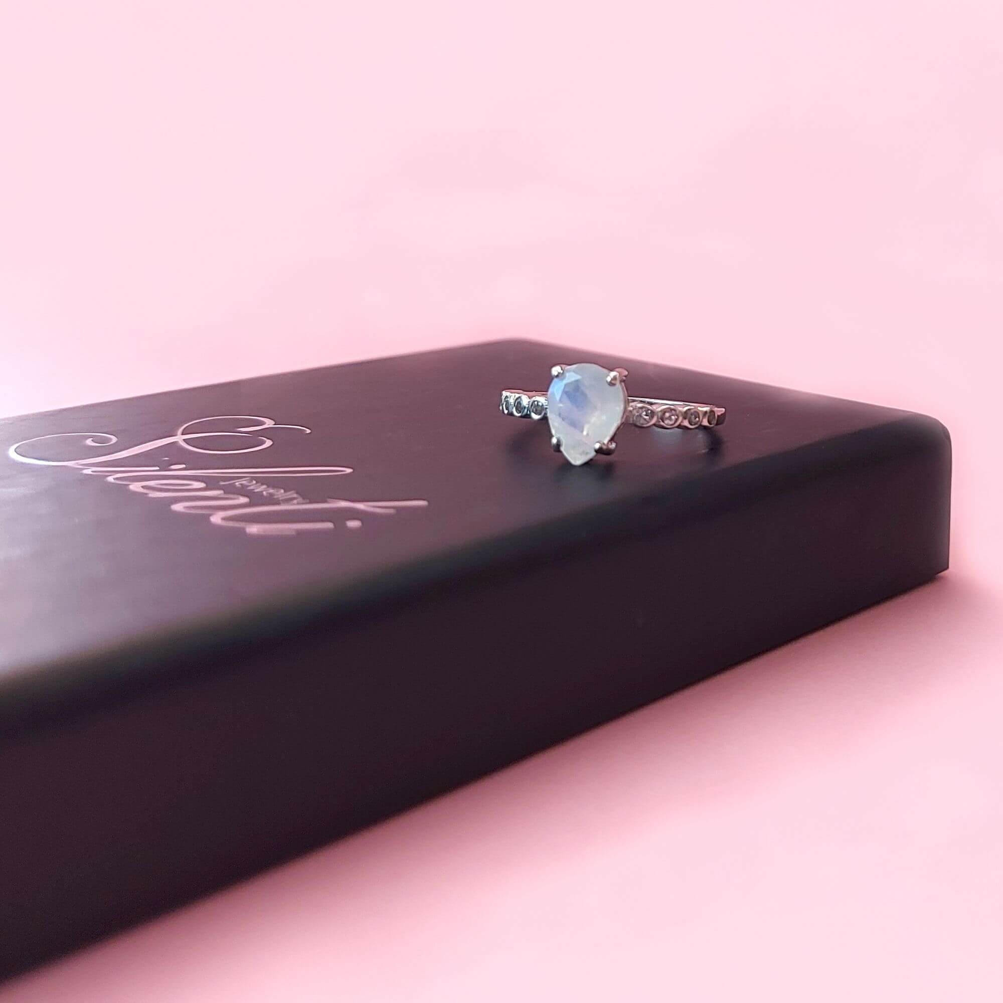 Sterling silver ring with a teardrop-shaped natural moonstone at the center, framed by white topaz stones on each side. The contrast between the irridescent colours of the moonstone and the clear sparkle of the topaz creates a calm, harmonious look.