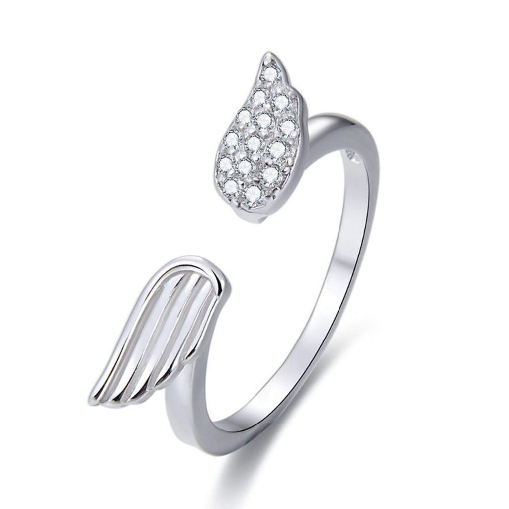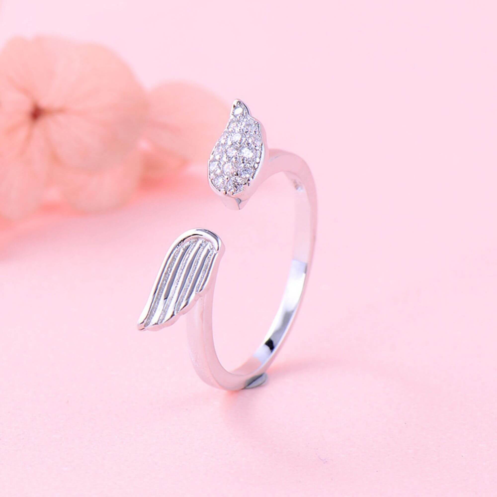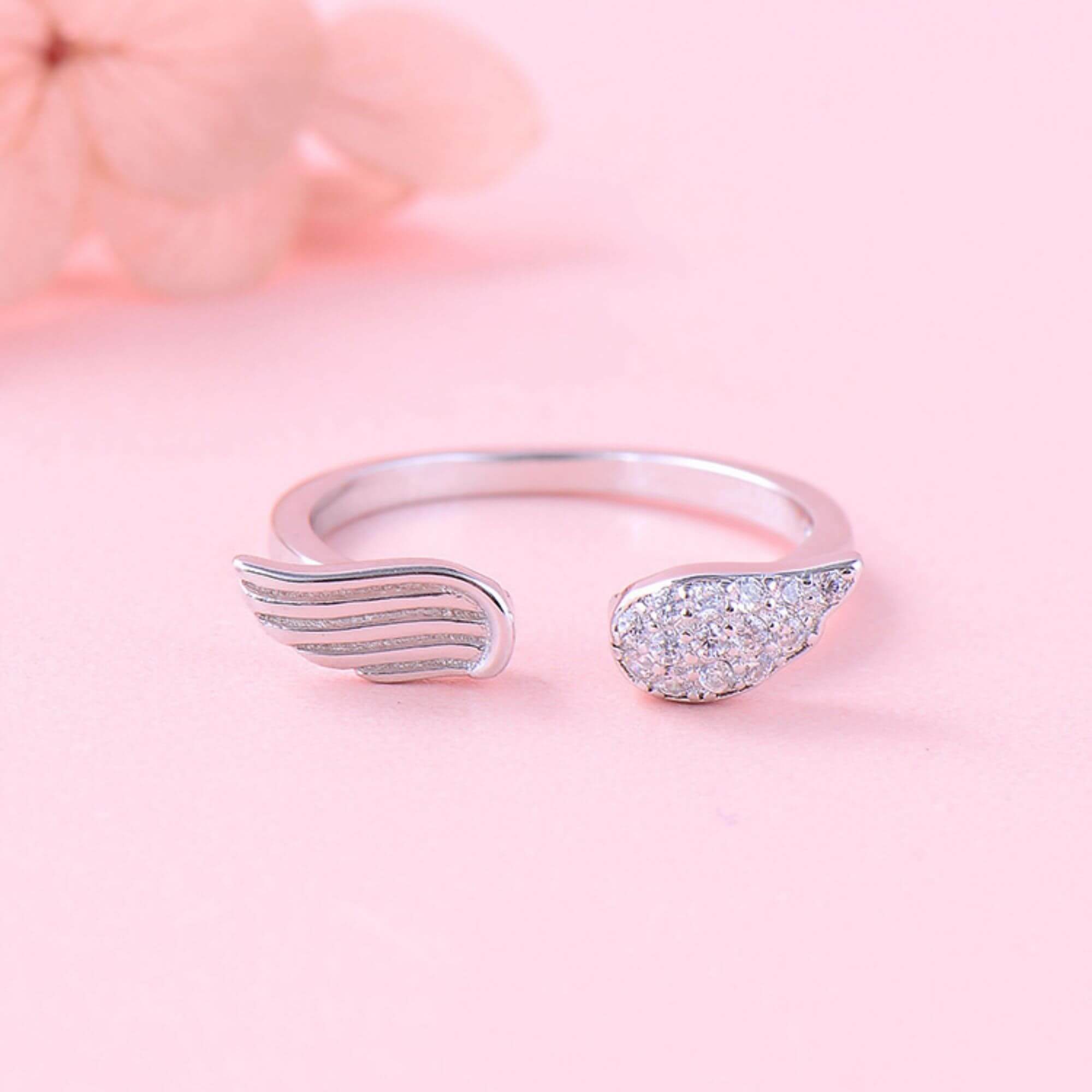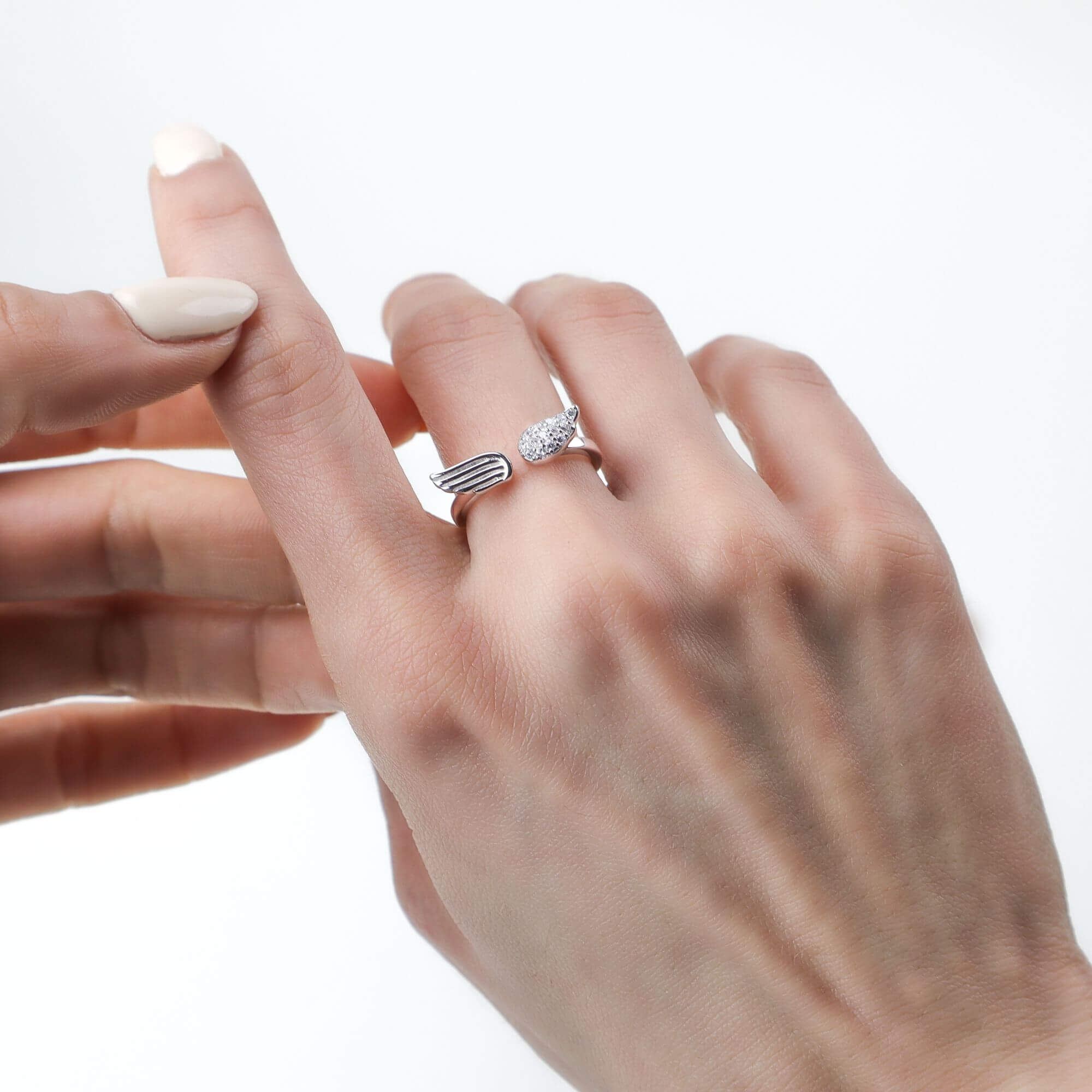 Sterling silver ring with an open shape and two beautiful angel wings at each end. The design represents freedom and protection, while the adjustable fit makes it super easy to wear every day.