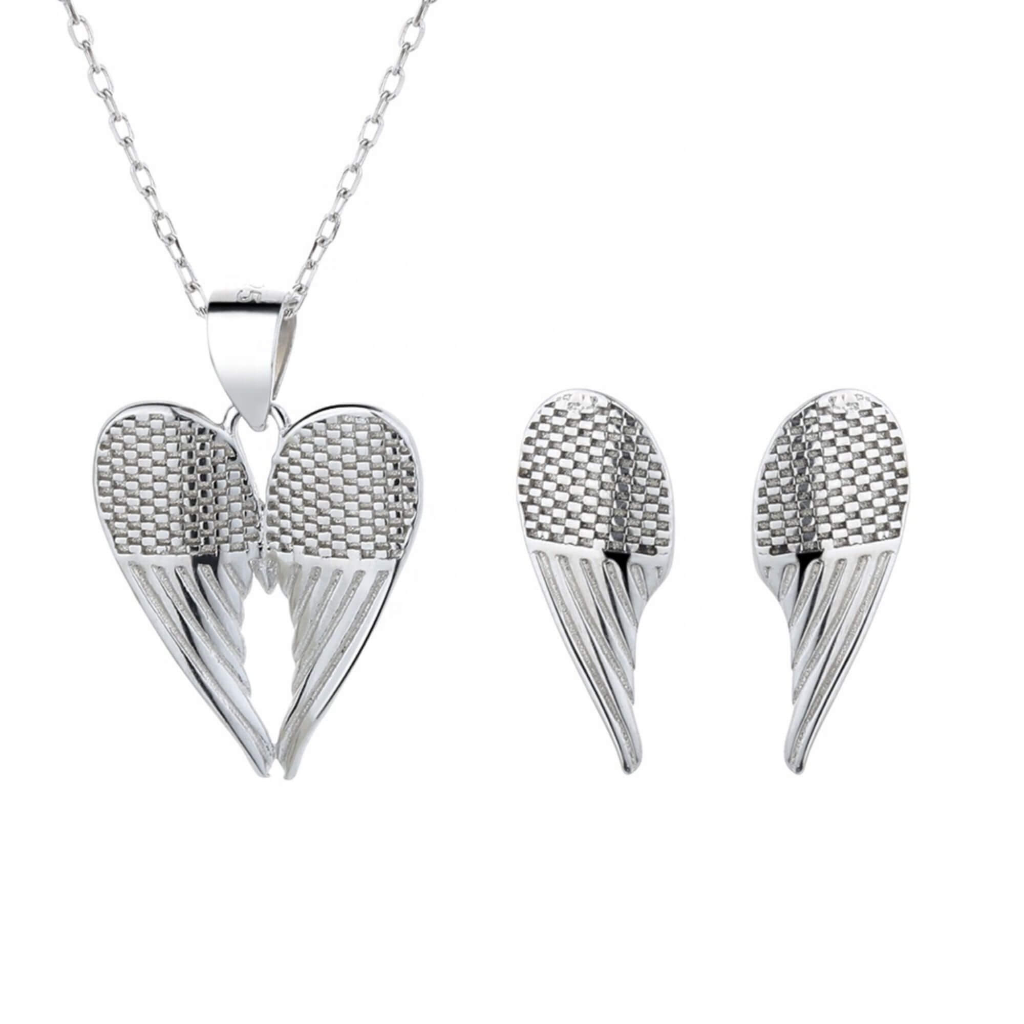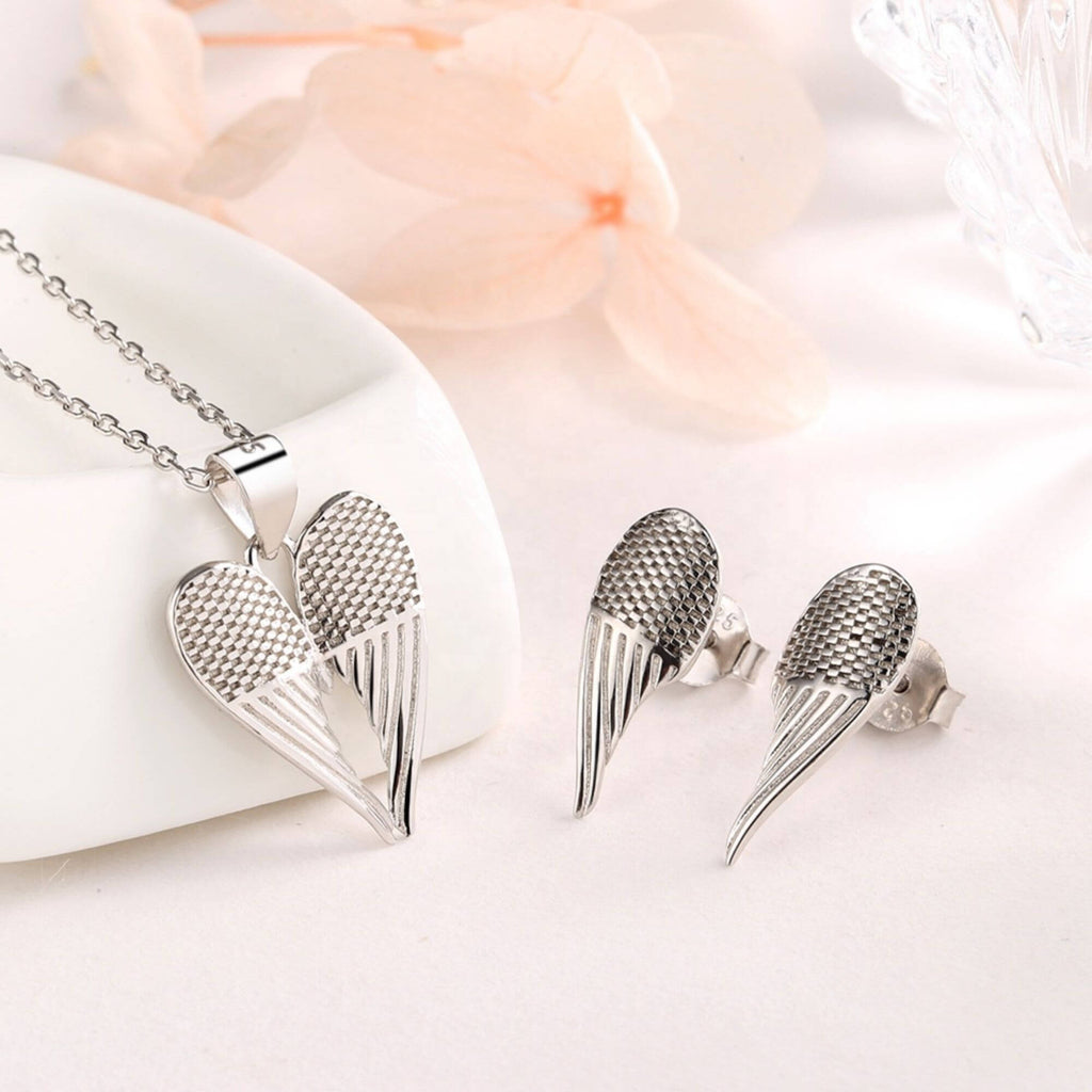 Our angel wing silver set combines elegance with symbolic meaning. The necklace and earrings, when paired together, form a heart, signifying love's true essence. This exquisite set, perfect for expressing deep emotions and affection, makes an ideal gift for someone close to your heart, embodying both grace and sentimental value.